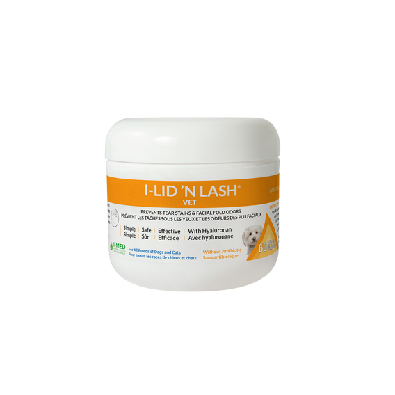 I-LID ’N LASH® VET est le moyen le plus sûr et le plus efficace de nettoyer la paupière et les cils en aidant à éliminer les débris extra-oculaires et en réduisant le nombre de bactéries et de levures (charge biologique).